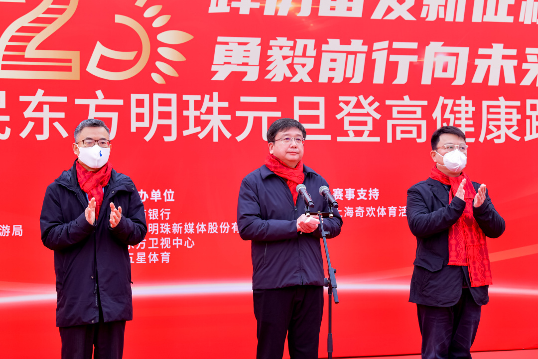 伴随着开场歌舞《健康动起来》,元旦健康跑拉开帷幕。上海市政府副市长陈群宣布2023上海市民东方明珠元旦登高健康跑开幕。