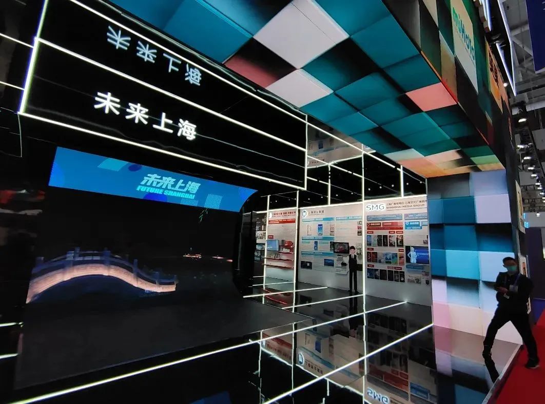 在上海文广集团展示区的巨幅可触控魔屏,展示了SMG近年优秀影视剧《功勋》《光荣与梦想》《大江大河》《大江大河2》《在一起》《两个人的世界》等。