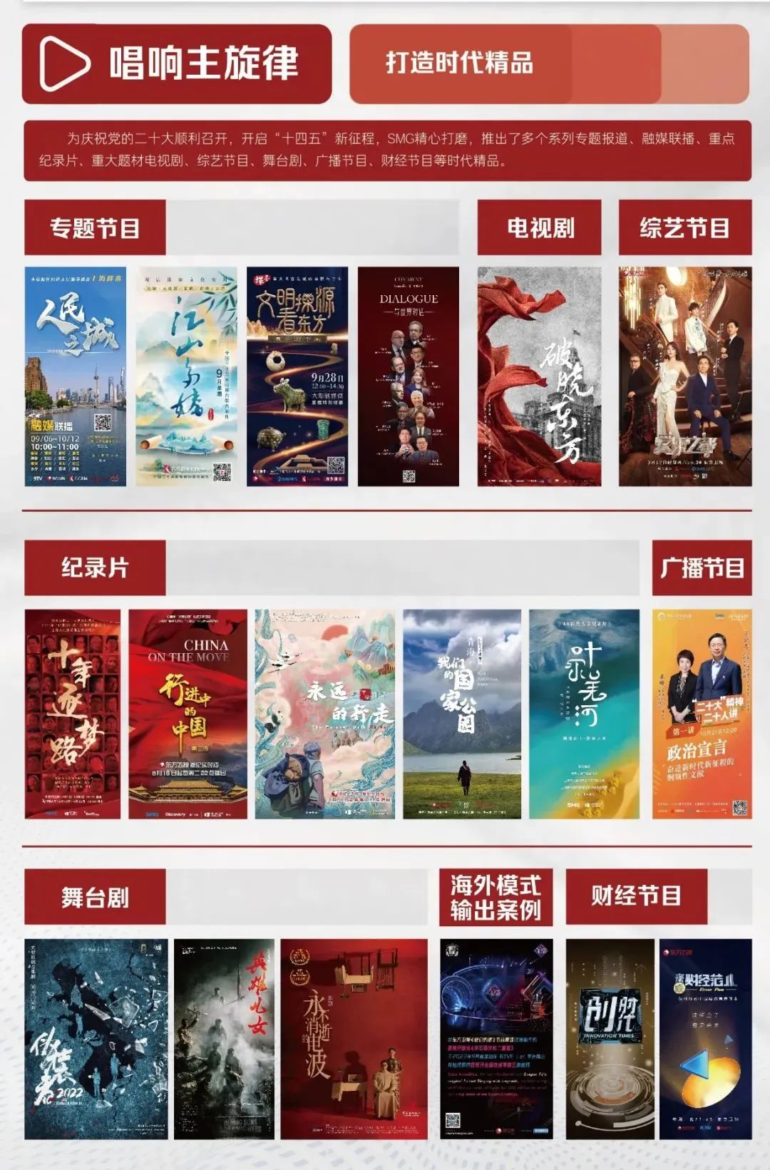 具体包括:专题节目《“人民之城”》融媒体联播、《江山多娇——探访国家文化公园》融媒报道、《“最早的中国·文明之美看东方”》直播特别报道、《与世界对话——引领未来的中国智慧》系列访谈纪录片《十年逐梦路》《行进中的中国》重大革命题材剧《破晓东方》全国首档全产业链音乐剧文化推广节目《爱乐之都》;海外模式输出案例《我们的歌》音乐剧《伪装者》《永不消逝的电波》、话剧《英雄儿女》;广播节目《二十大精神二十人讲》;财经节目《来点财经范儿》等。