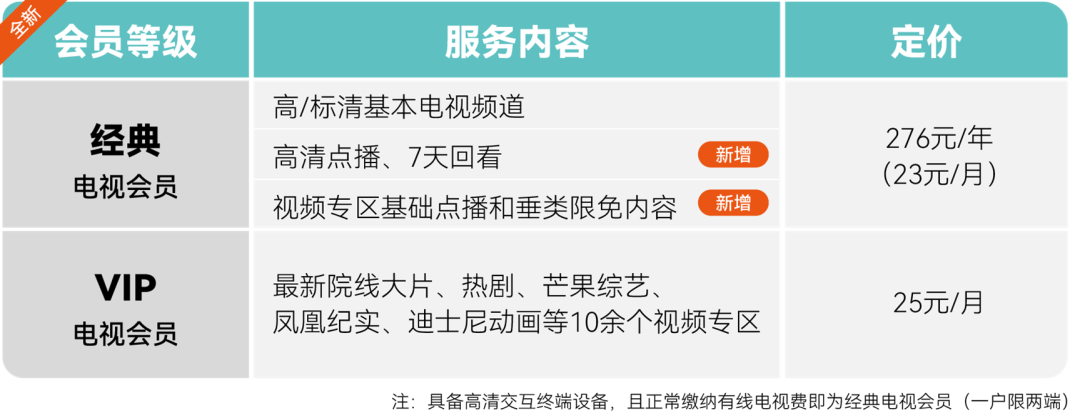 原有线电视用户(具备设备条件下)将可升级为经典电视会员,在资费不变前提下,增加高清点播及回看功能,大幅提升内容服务量。