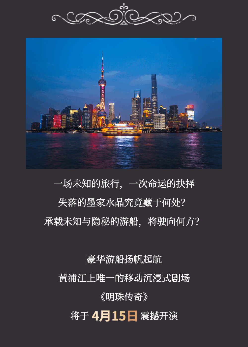 全国首批5A级旅游景点、上海城市地标,东方明珠广播电视塔于4月15日全新推出水上沉浸式娱乐项目,将时下颇受年轻人喜爱的剧本杀搬上游船,率先打造黄埔江上唯一的移动游戏剧场《明珠传奇》,带来震撼人心的360°实景水上娱乐新体验。