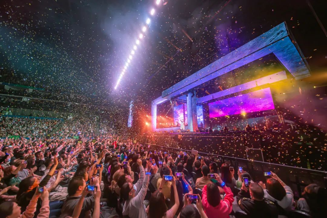与传统的三面台相比,四面台容纳人数更多、视觉距离更近,灯光舞美氛围更强,音乐编排和舞台的结合度也更高,而梅奔中心作为演唱会场馆的行业标杆,更能将四面台的优势发挥到淋漓尽致。
