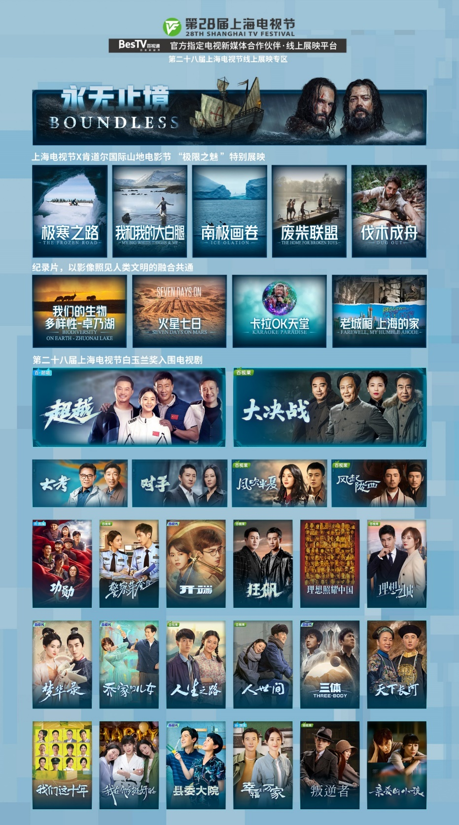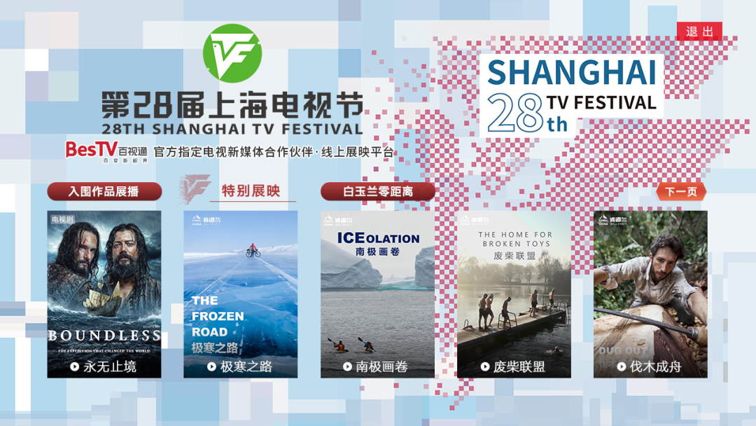 尤为值得一提的是于6月19日电视节开幕当天盛大开启的“线上展映”专区。包括6集西班牙航海冒险剧集《永无止境》、5部肯道尔国际山地电影节纪录⽚《极寒之路》《我和我的大白腿》《废柴联盟》《南极画卷》《伐木乘舟》,以及《卡拉OK天堂》《火星七日》《老城厢 上海的家》《我们的生物多样性-卓乃湖》在内的10部上海电视节线下惠民放映剧目,将全部亮相百视通线上专区,带向全国1.4亿IPTV、互联网电视大屏用户,线上线下同频共振,让全国观众“云上”共享上海电视节。