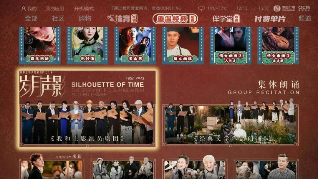 丰富内容供给方面,东方有线于2023年9月推出了“重温经典”免费点播专区,汇聚来自上影厂、上海美影厂等的经典作品,为用户奉上富有鲜明海派特色和怀旧风格的优质影视内容。百视通升级后的免费专区节目量达10万小时,专区首行显著位置不断更新推荐当周精彩“限免”内容。用户可通过分类入口筛选查找喜爱的免费节目,百视通自主研发的智能推荐系统还将根据用户收视喜好展示推荐相关内容。