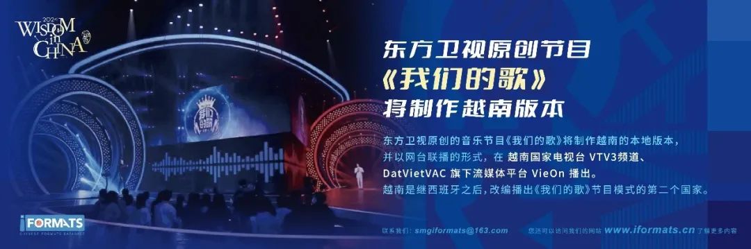 近日,上海广播电视台互联网节目中心iFORMATS中国节目模式库项目团队正式官宣,团队与越南最大节目内容供应商Dong Tay Promotion Corporation签署模式制作合约,东方卫视原创音乐节目《我们的歌》将于今年启动越南语模式改编版本。越南是西班牙之后,在全球范围内制作播出《我们的歌》节目模式的第二个国家。