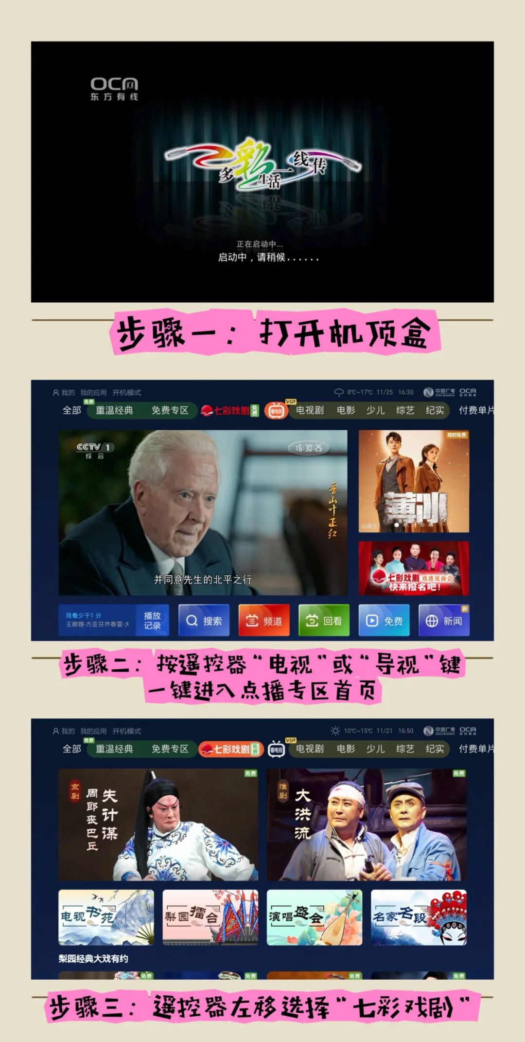 只要您开通了东方有线点播功能,打开机顶盒,进入点播专区首页“看电视”,遥控器左移选择“七彩戏剧”,即可免费收看。若您家机顶盒无法看到“七彩戏剧”免费点播专区,可联系东方有线客服热线96877获取帮助。