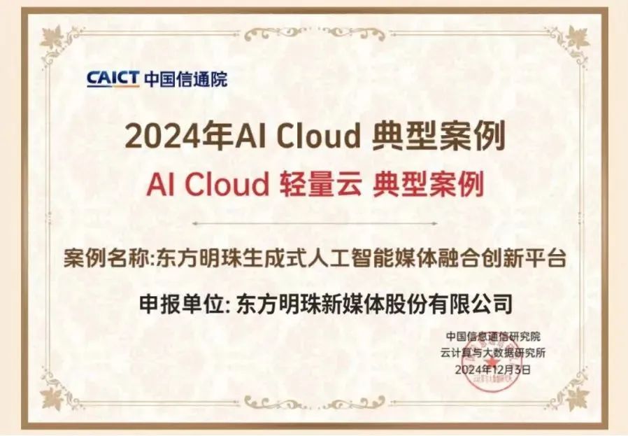 东方明珠生成式人工智能媒体融合创新平台荣获AI Cloud轻量云典型案例