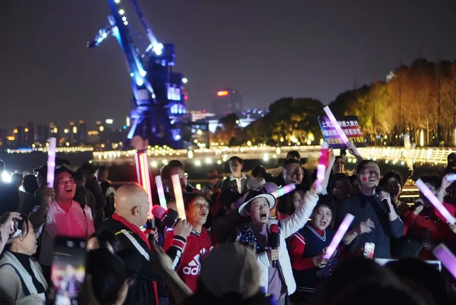 晚上7:00,演唱会开始,场内不断升温,场外,没抢到票的“刀迷”们也聚集在黄浦江边的世博公园一角,在各自的直播间里开启了他们自己的演唱会。一位长相酷似刀郎的人,正唱着刀郎的《情人》,旁边一群人挥舞着手中的玫瑰花,唱着跳着,没抢到票也很开心。不远处,另一群“刀迷”手中摇晃着灯牌,合唱起《驼铃》。在他们热情的歌声里,世博公园、黄浦江、卢浦大桥的美景,也通过一个个直播间,唤起更多人对这座城市的向往。