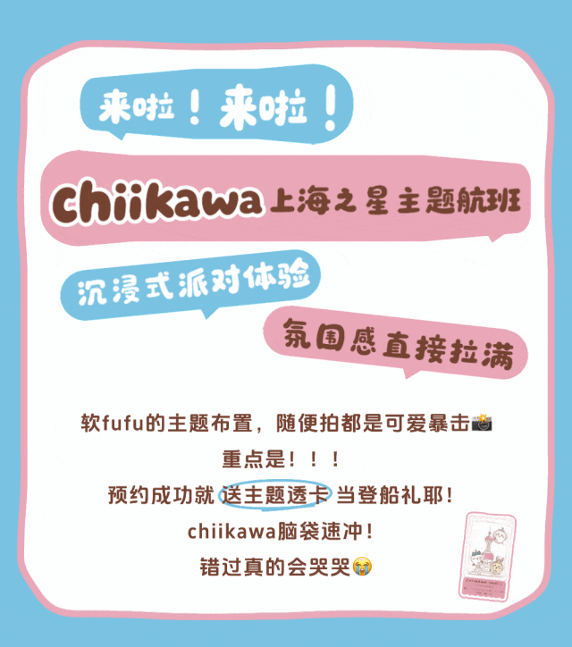活动期间“上海之星”游船全方位主题升级,外立面覆盖活动主题画面,内部以蓝天白云为背景,呈现吉伊卡哇与伙伴们的欢庆场景。登船游客均可获赠纪念船票。
