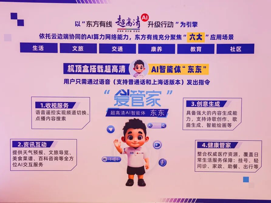 “东东”是东方有线面向智慧家庭场景打造的超高清+AI融合创新产品。依托机顶盒、电视机及多屏终端,集成AI语音交互、AIGC内容创作及多模态交互技术,突破传统电视大屏单一视听功能边界,向普惠养老、文娱生活等多元场景延伸。